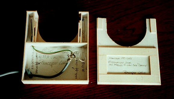 This is the sensor that senses the movement of the hamster in her cage. I use a habitrail cage with tubes in all kinds of sizes. These tubes all have the same diameter, therefore designing an IG-gate for them was fairly straightforward.